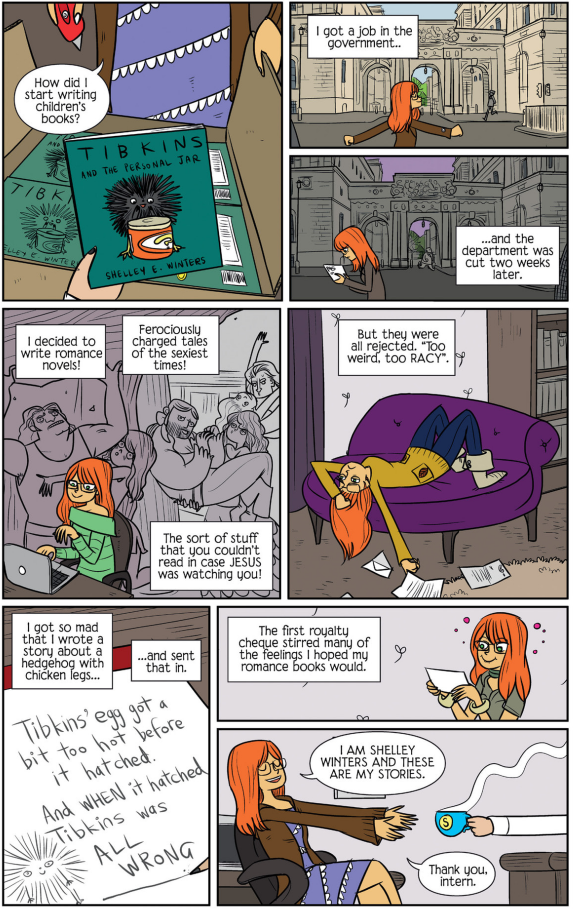 [ he laughs, thinking about erin writing a kid's story... ]